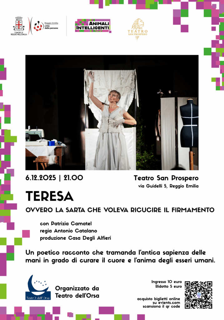 Altro appuntamento all’interno della rassegna “Animali Intelligenti” si terrà il 6 dicembre ore 21:00 sempre al Teatro San Prospero, con lo spettacolo “Teresa ovvero la sarta che voleva ricucire il firmamento”.